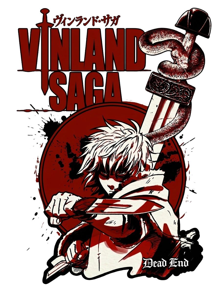 Design Brutalista: Arte inspirada na jornada de Thorfinn e Askeladd, focada na filosofia de "não ter inimigos" e na estética viking sombria.